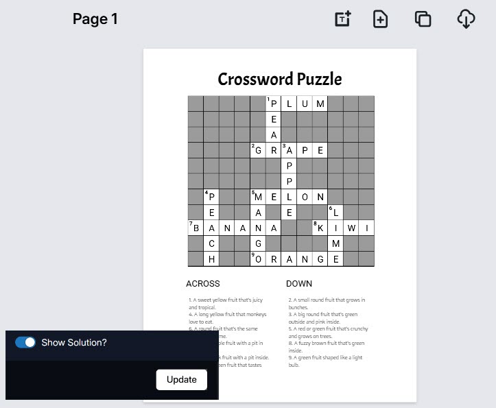 Add the words and clues to your crosswords puzzle to customize it and make it your own in a matter of minutes. Drag and drop the clues on the canvas and place it wherever you want to give it a look that you want. Then use the 1-CLICK clone feature to create the next page and so on.